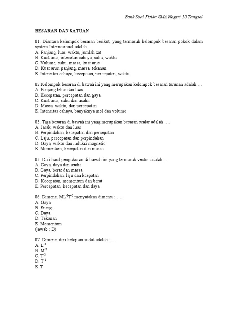 Bacalah setiap soal dengan teliti. Contoh soal dan pembahasan besaran dan satuan ini terdiri dari dua jenis soal, antara lain soal pilgan (multiple choice) dan soal essay besaran dan satuan. Contoh soal besaran dan satuan pilgan essay dan jawabannya muttaqin id. Kondisi dan peristiwa itu abadi, yaitu. Makalah materi soal penjas kelas 10 sma/ma diterangkan mulai dari sd, smp, atau sma, mts, ma dan smk lengkap dengan jawabannya serta pembahasannya.